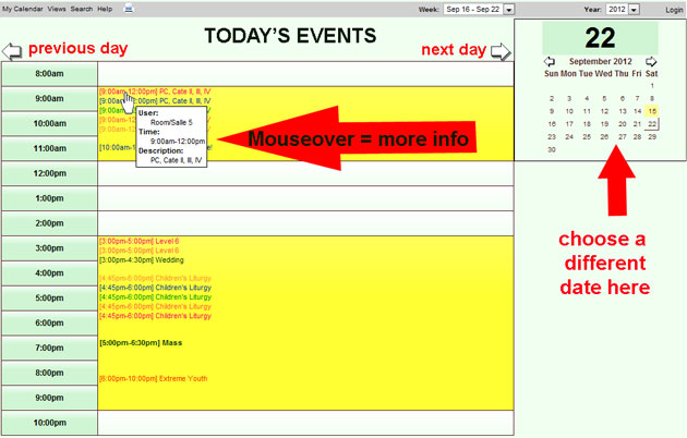 - The different rooms are color coded in the daily, weekly and monthly views. Place your mouse over an entry to view more info. Double click an entry to view more details.